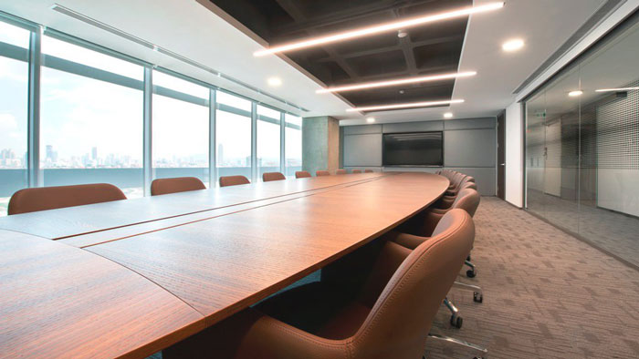 會議室的設計:整個會議桌呈橢圓式分布,幾乎占據(jù)了整個空間的中心區(qū)域,這樣做也是為了滿足企業(yè)對于人數(shù)的需求,同時也是為了采用去中心的設計手法,在這樣的空間中思維與想法不會受到任何的阻隔,同時水景的引入,也給會議一種一往無前的暗示。