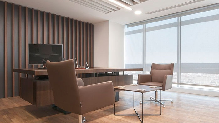 總經(jīng)理辦公室的設計:此處采用極簡+新中式的設計手法,這也是設計師與總結里本人相互討論的結果,中式本身就是文化的一種濃縮,而中式本身對于心境的提升就很有好處,設計師希望中式可以提升總經(jīng)理本人的心境,同時簡單的空間也為思考問題提供更多的可能性。