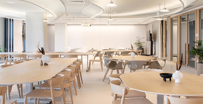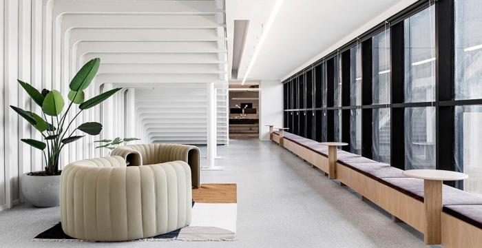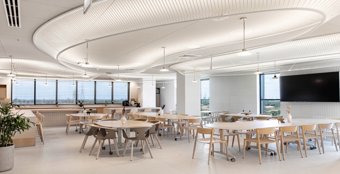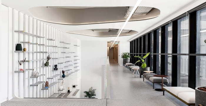 設(shè)計(jì)師將材質(zhì)、定制元素、形式和圖案組合賦予空間靈魂。最直觀的表達(dá)體現(xiàn)于室內(nèi)天花的構(gòu)造上,有機(jī)形式的開放式天花設(shè)計(jì),局部裸露出頂面的管道機(jī)械系統(tǒng)。另一個(gè)就是位于餐廳的獨(dú)特頂面裝置,其形式來自于對(duì)四個(gè)心腔輪廓的模擬。這組三維裝置強(qiáng)化了客戶的行業(yè)屬性和奮斗的目標(biāo),為空間帶來與眾不同的體驗(yàn)。