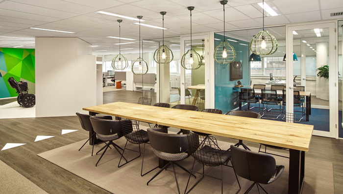 會議室的設計:相信大家看到很多會議室都是封閉式的,此處設計師提出了一個新的想法,就是打造一處開放式的會議室,但開放式不是說設計就設計的,而是要觀察四周的格局是否能夠完成,最后發現此處剛好處于菱形空間的中心區域,其他區域對此處的影響微乎其微。