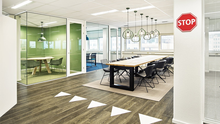 動線的設計:通過地上的標志大家有沒有想到什么,對的你沒有想錯,就是交通圖標,這是設計師受到交通圖標的啟發,認為空間的動線不僅要滿足人走也要滿足代步車走,這樣交通圖標就不可缺少,讓彼此各行其道,紅色的STOP提示著此處不通、請繞行,避免了對辦公區域的影響。