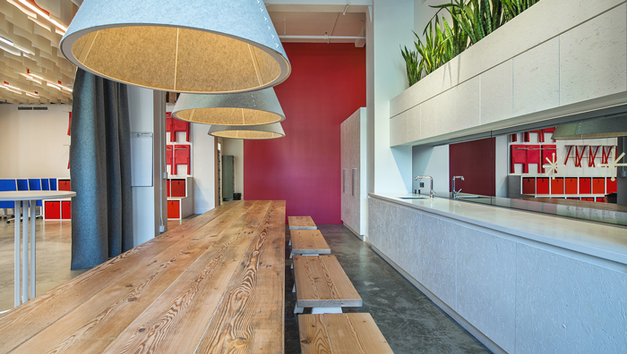 茶水間的設(shè)計:白色的茶水臺將茶水用具都涵蓋在其中,讓墻與茶水臺合為一體,這樣設(shè)計的好處就是讓空間得到合理的開發(fā)與利用,在設(shè)計師的想法當中,希望讓員工在這里可以相互交流,故此設(shè)計師在此次安排了一個交匯場所,目的就是希望讓員工在此處匯合彼此交流心得。