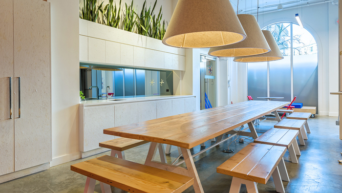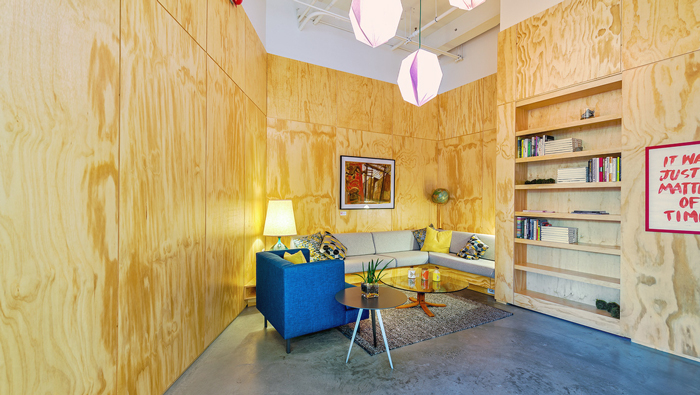 交流區(qū)域的設(shè)計:當桌椅收攏起來之后,此處空間就擁有了更多的可能,這也是設(shè)計師設(shè)計的初衷,椅子被懸掛在墻體之上,儲藏柜按照層級依次向上,一方面可以在此處休息,另外一方面也為掛取椅子提供了保障,可折疊的桌子以此排列在儲藏柜的左側(cè),當桌椅被收攏之后,被設(shè)計師巧妙的設(shè)計為空間的點綴物。