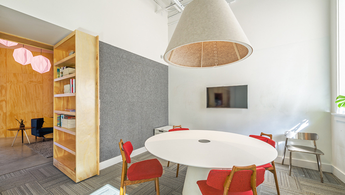小型會議室的設(shè)計:我們首先看到的就是一個機關(guān)門,在外看是一個書架,往內(nèi)推開卻是另有一番天地,這也是設(shè)計師設(shè)計中的一點點小趣味,在設(shè)計師看來趣味是辦公中的調(diào)劑,設(shè)計師希望員工在辦公中不是一成不變的,而是幽默、活躍、有趣。