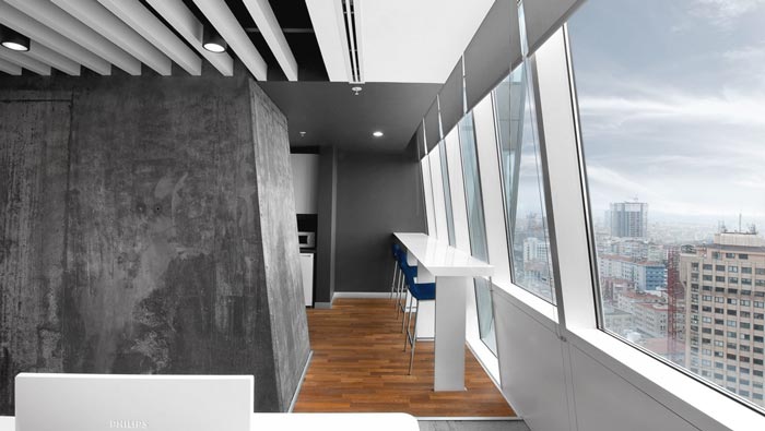 茶水間的設計:此處位于窗邊的空間,設計師這樣設計的目的,就是希望將此處的優點完美的發揮出來,吧臺位于窗邊,在這里可以眺望整個城市,設計師希望員工在這里可以放飛自己,在這里可以暫時的忘記一切,在自然的景觀中,讓自己得以歸零并重新開始。