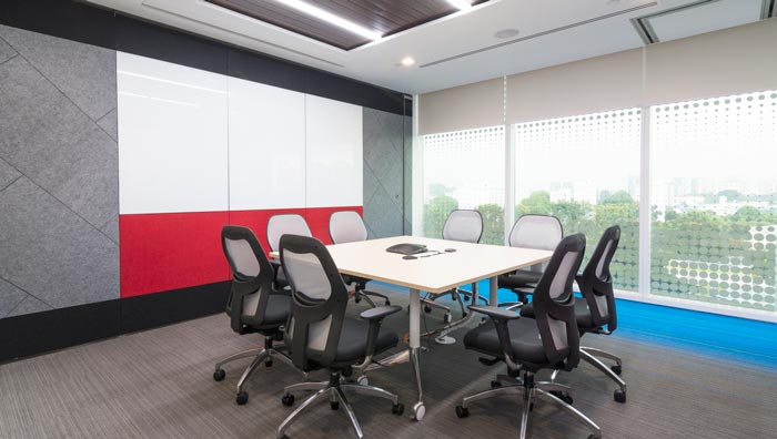 會議室的設計:此處的空間是一個活動的、可組合的空間,相信大家都看到每一個桌椅下方都有轱轆,這也是設計師此處設計的重點,設計師新聞會議室可以自由的進行重組,這樣做的目的就是希望將會議室的作用開發到極致,在平時會議室可以重組成小型會議室和交流空間,讓空間的作用無限放大。