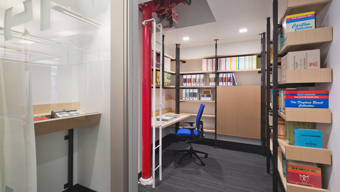 接待區(qū)域的設(shè)計:當(dāng)客戶跨過前臺之后,順著動線就進(jìn)入到接待區(qū)域,接待區(qū)域被設(shè)計師安置在動線、空間的交叉處,此處不管是向左還是向右,可以進(jìn)入到兩個不同的空間,在此處安置接待區(qū)域,不僅可以起到接待的作用,同時也不會對空間造成影響。