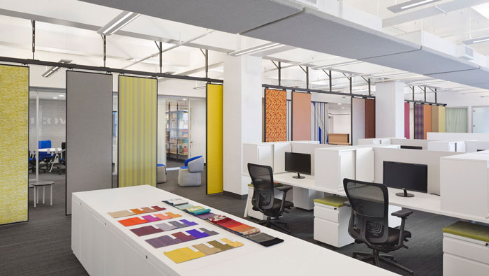 前臺的設(shè)計:前臺與辦公區(qū)域位于空間的左右兩側(cè),設(shè)計師在辦公室設(shè)計中,將隔斷打造成布匹的模樣懸掛在空間的中心區(qū)域,這樣一來客戶進(jìn)門后看到的就是一段段懸掛著的布匹,在顯示企業(yè)屬性的同時,也起到空間阻隔的作用,前臺縱橫加錯的絲線仿佛是織布的線條,這無不在顯示企業(yè)的屬性。