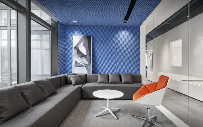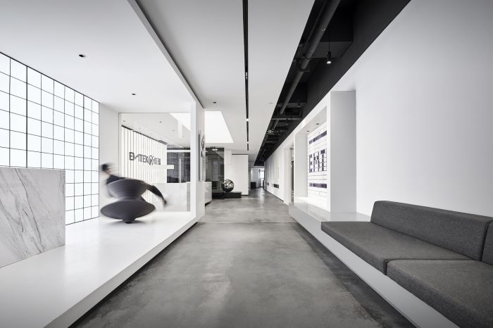 這是一個(gè)檢測(cè)科技公司辦公室的設(shè)計(jì),有1000方的面積。設(shè)計(jì)師在重新設(shè)計(jì)品牌空間時(shí),通過延續(xù)黑白灰的基調(diào),加入對(duì)立、沖突的元素,消解空間軸線的刻意規(guī)律感。