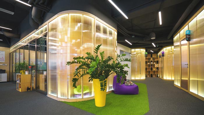 進(jìn)門區(qū)域的設(shè)計(jì):當(dāng)客戶進(jìn)入空間之后,首先感受到的就是綠色與生態(tài),綠色的地毯與綠植相互搭配,為空間增添了些許活力與特色,讓整個空間活了起來,同時綠植也可以定期的進(jìn)行更換,以此讓辦公空間時刻充滿活力與新意,讓空間可以時時變換。