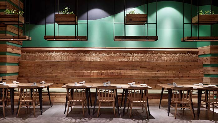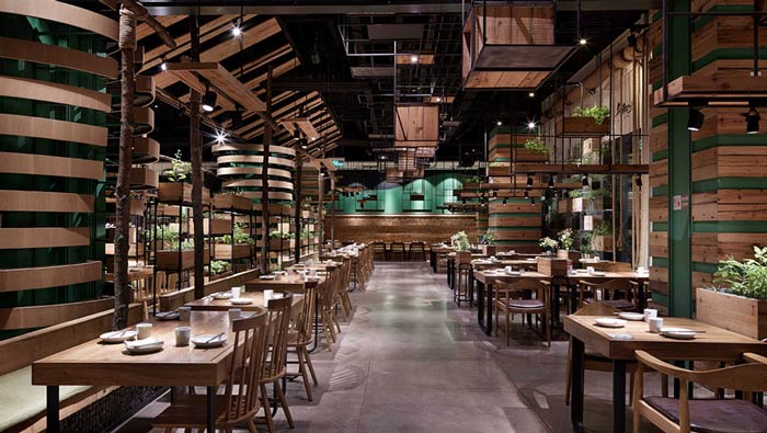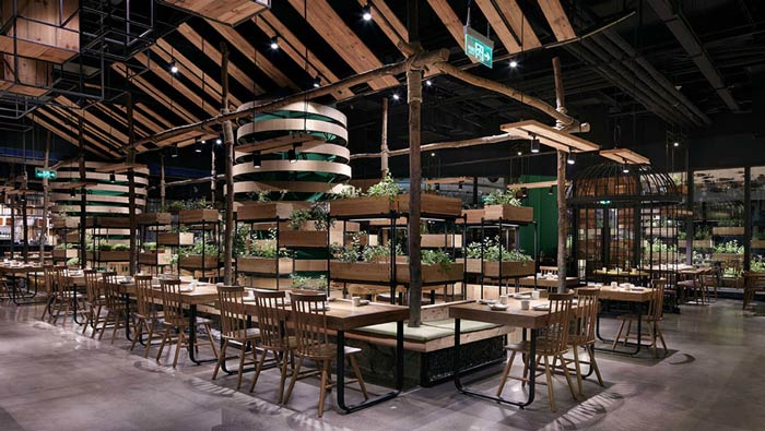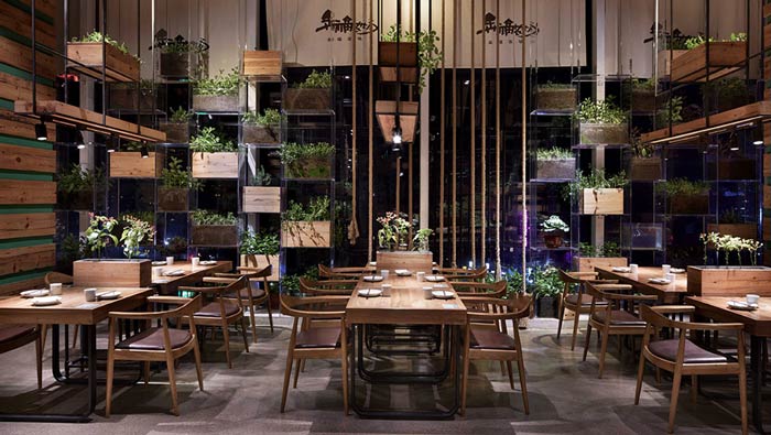 特色生態(tài)餐廳餐區(qū)設(shè)計(jì):蔬菜陳列架在空間隨處可見(jiàn),設(shè)計(jì)師把陳列架量化,成為空間的最小單元,這樣易于隨著季節(jié)的更換及搬運(yùn),空間四周滿(mǎn)滿(mǎn)的種植區(qū),賦予空間生命力。