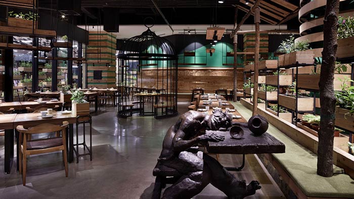 特色生態(tài)餐廳餐區(qū)設(shè)計(jì):業(yè)主是有文藝情懷的理想家,為此在入口處添加一組銅雕塑,一個(gè)酣醉淋漓的人,做著酒足飯飽的美夢(mèng),同時(shí)也增加了視覺(jué)的沖擊和空間的趣味性。