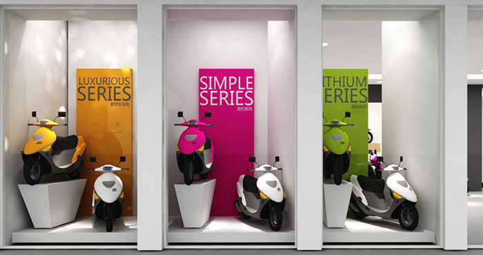 設計理念:設計師在設計之初,首先考慮到就是顧客見到店面的第一感覺。因為顧客進到店面之后第一眼看到的就是電動車烤漆的顏色,這樣就會直接影響到顧客的第一眼感覺。設計師在設計的時候都會盡最大的努力把顏色作為重要的考慮。把顏色盡最大化的展現出來,讓白天陽光照射下來之后,會感覺到漆面顏色亮麗出彩,這樣就可以盡最大努力的讓用戶來的第一眼就對店面有一個很直觀的看法,可以贏得用戶的好印象。