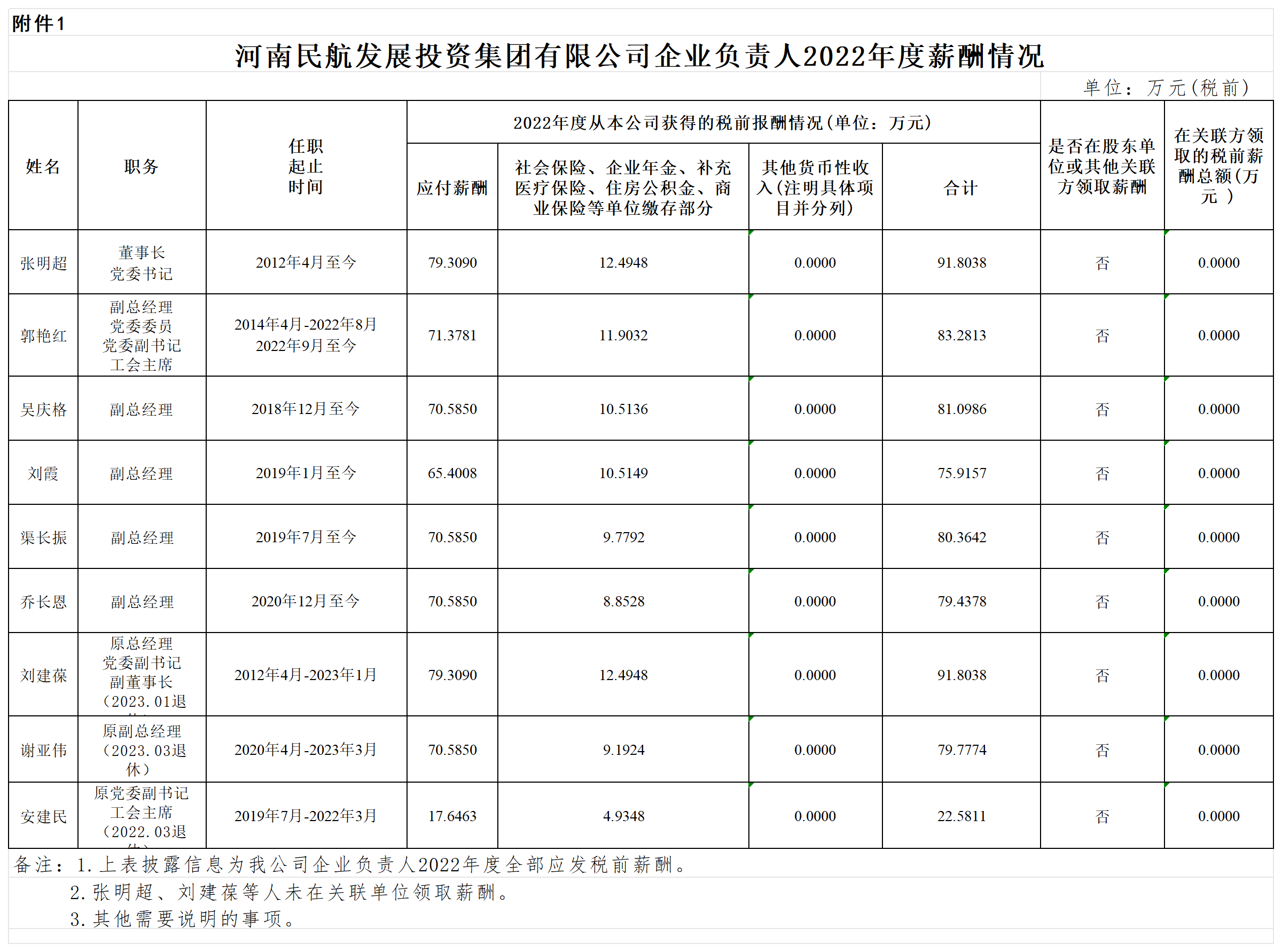 河南民航發(fā)展投資集團有限公司企業(yè)負責人2022年度薪酬及2020-2022年任期激勵收入情況