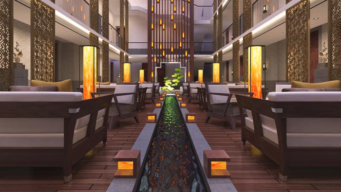 大廳的設計:顧客進入大廳之后,給人的第一感覺就是小溪流入百姓家的感覺,酒店的整體格局是回字形建筑,故此設計師在設計中,就充分發揮建筑本身的優勢,頂部銀河般的燈帶仿佛彩云一般,上頂彩云、下有小溪,給人營造一個生態化的自然氛圍。