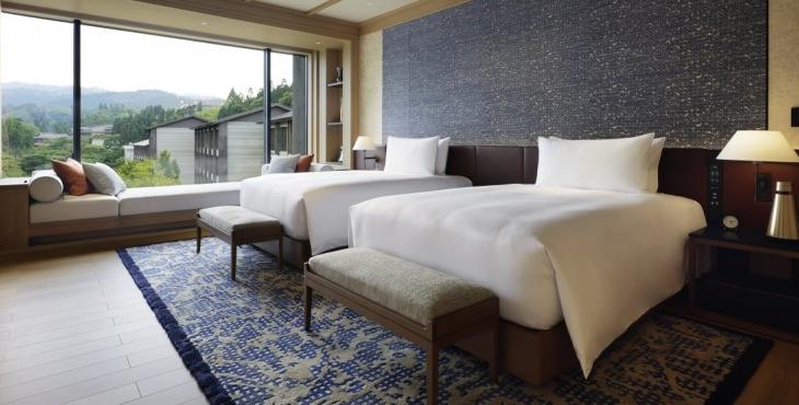 整個酒店的室內設計與場地的自然環境相輔相成,這得益于設計事務所受到傳統日本色彩的啟發,以溫暖的泥土色為空間基調。酒店客房區域,標準客房和套房的面積從50㎡到110㎡之間,雖大小不等,但都配置了舒適的沙發床和開放式概念浴缸,讓客人更好的體驗傳統京都里的泡湯文化。