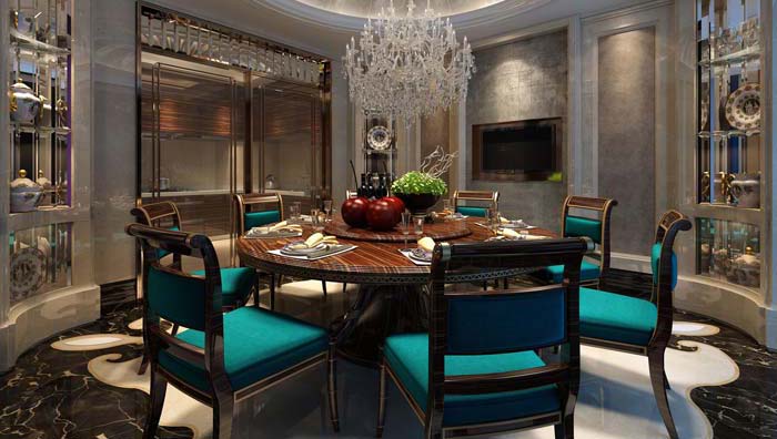 自然中,曲線最美,設(shè)計(jì)師把它運(yùn)用到餐廳上。圓的天花,曲線地花,曲線大理石飾柜等,令整個(gè)空間自然流暢。