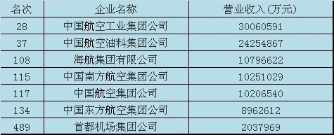 海航集團(tuán)有限公司以1079.6億元的營收位列108名,中國南方航空集團(tuán)公司以1025.1億元的營收居115位,中國航空集團(tuán)公司以1020.6億元的營收排在第117位,中國東方航空集團(tuán)公司以896.2億元的營收排在第134位。首都機(jī)場集團(tuán)公司以203.7億元的營收排在第489位。