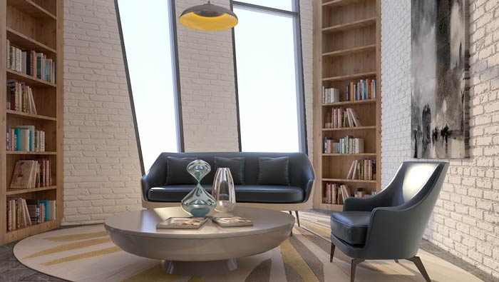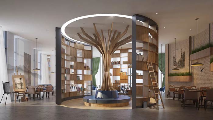 咖啡廳閱讀室裝修設(shè)計(jì):兩個(gè)半圓圍繞而成的閱讀區(qū)域,兩個(gè)半圓以圖書架的方式出現(xiàn),既起到阻隔空間的作用,同時(shí)也起到擺放書籍的作用,客戶在這里可以享受到暫時(shí)的寧靜。