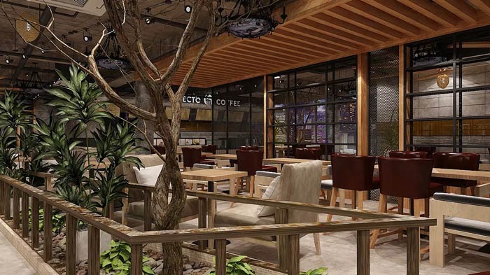 咖啡館樹木裝飾設(shè)計(jì):樹木位于桌子的內(nèi)側(cè),之所以這樣安排,是希望讓客戶感受一下在大樹下看書的感覺,在鋼筋水泥的城市中,設(shè)計(jì)師希望拉近人與自然的關(guān)系。