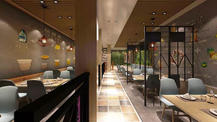 中式快餐店一樓餐區設計:一樓由收銀臺、吧臺、餐區構成,收銀臺主要用作結賬,吧臺主要用作菜肴的傳遞,餐區主要以雙人桌為主,餐桌與餐桌之間,用隔斷進行隔離。