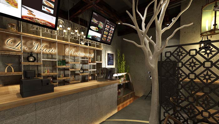 特色快餐店前臺裝修設計:既然是特色快餐廳,自然菜肴也是定制化的,不同的就是這里的上菜速度十分迅速,業主在速度、美味之間取得平衡,以此滿足客戶的需求。