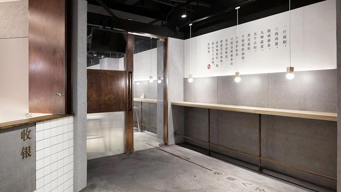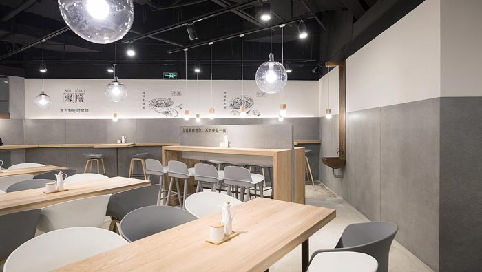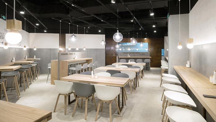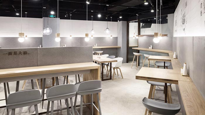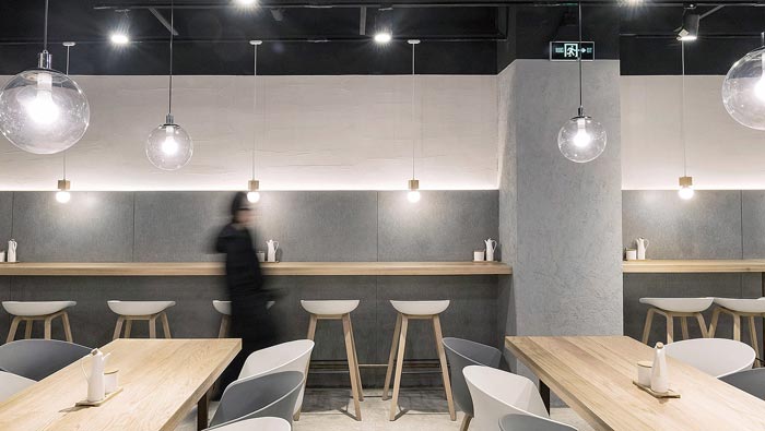 牛蛙面館餐位裝修設(shè)計(jì):對著墻壁吃面不免局促孤單,而這正是店主與設(shè)計(jì)師想傳達(dá)的理念“專心吃好一碗面”,對著水泥墻面,吊著一盞溫暖小燈,將注意力集中在食物上。