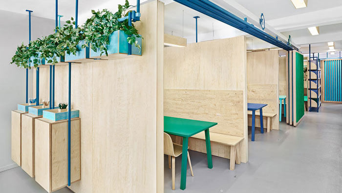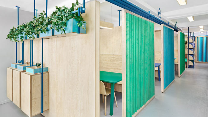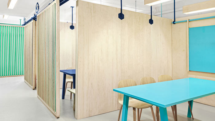 英語教育培訓機構隔斷門設計:此處與上圖估計第一眼都感覺是一樣的吧,其實不然,教師的門被推開了,開放與獨立皆在一念之間,設計師讓設計活了過來。