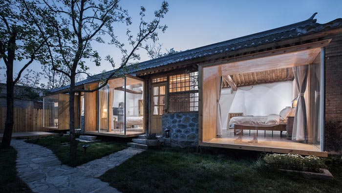 本案為鄉村景區民宿改造,改造策略為保留原有木結構,更新部分外界面,拆除原有破敗的屋頂,增加保溫層和防水層,增加天窗,并將原有的小青瓦回收再利用。