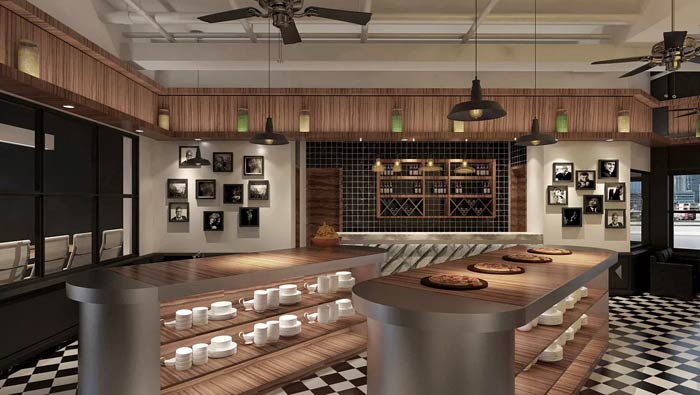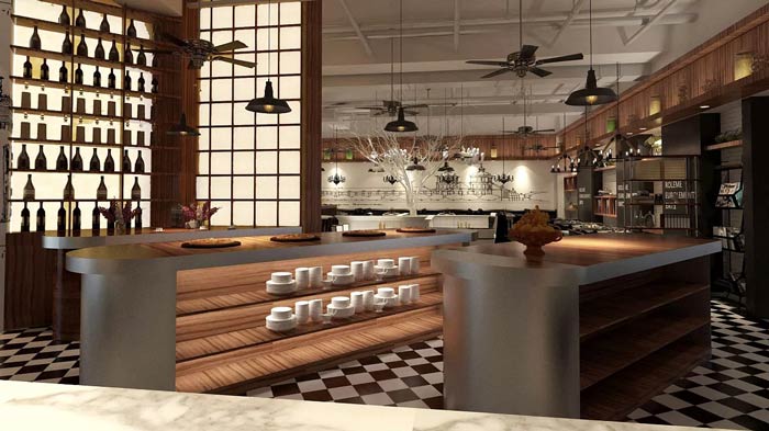 休閑西餐廳擺放區(qū)裝修設(shè)計(jì):廚房的食物會(huì)先經(jīng)過(guò)這里,然后端到客戶面前,之所以這樣做是希望,從食品、服務(wù)員、餐具給客戶一種精致的感覺,讓客戶感受到吃飯也可如此精致。