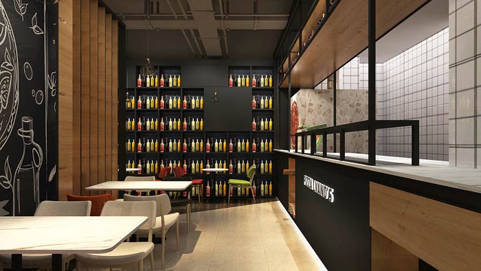 主題西餐廳進(jìn)門(mén)區(qū)裝修設(shè)計(jì):進(jìn)門(mén)左側(cè)是吧臺(tái),這是展示著各式各樣的披薩,將披薩放在空間的進(jìn)門(mén)區(qū)域,是希望讓客戶(hù)在進(jìn)門(mén)的第一瞬間,就被餐廳的美食所吸引。