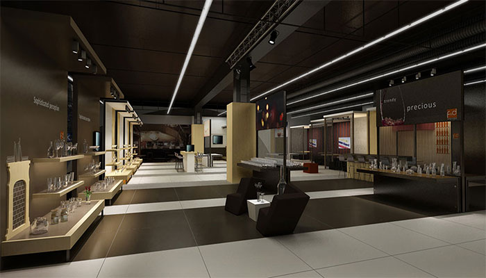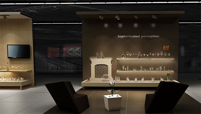 設計理念:本展廳主要是透漏出玻璃器皿的個性,大家都知道玻璃器皿就是用玻璃所造的器皿。 玻璃藝術在我國保持了連綿不斷幾千年的發展歷史。明代萬歷年間,山東博山的料器制作已十分繁榮興盛,明末清初傳入北京,在清初康熙、雍正、乾隆時期,琉璃生產一度得到復興,清康熙三十五年,北京出現大規模的“琉璃廠”,生產皇宮享用的料器。在這期間,玻璃器皿的品種豐富多彩,造型與裝飾也有所變化。其中料仿玉、翡翠、瑪瑙、珊瑚等制成的瓶、碗、鼻煙壺、鳥獸等,顏色逼真,具有獨特風格和韻味。展廳中擺放著各式各樣的不同的玻璃器皿。讓我們感覺像是穿越時空一樣見到各個時期、各個朝代的不同類型的玻璃器皿。讓人不自覺的陶醉。感覺小小的玻璃杯中蘊含的是中華幾千年的歷史和中華幾千年來的見證。若是兩個戀人擁著此器皿,一定會為器皿之中所蘊含的中華文化所陶醉,正如杯以傾美酒,中山如有酒。酒后競風彩,美人雙翠幰。人稱入室賢,心跡竟難陳。