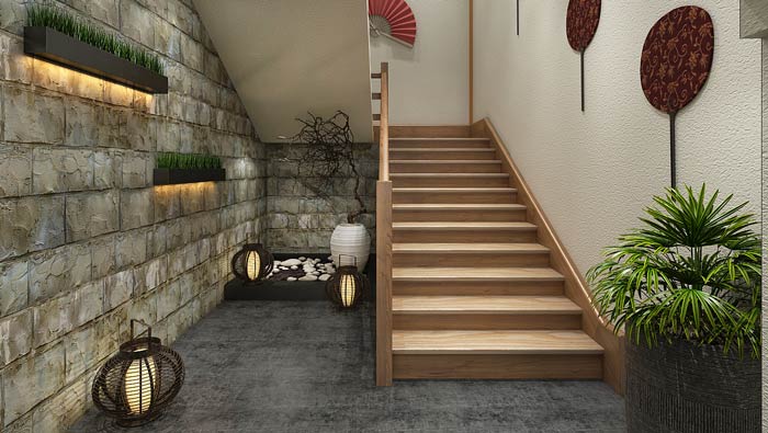 小型中式餐廳樓梯設計:在樓梯的設計中,設計師著重強調的是踏步的間距與高度,目的就是希望保證上樓的安全,這樣的踏間距即安全又舒適,將危險降至最低。