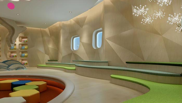 休息區域的設計:此處位于空間的一側,設計師在設計中將其設計成階梯式,即增強了空間的容納能力,同時也充分考慮到孩子的興趣與愛好,對于階梯相信很多孩子都有很大的興趣,或上火下或休息讓孩子自己決定,企業的目的就是不強加給孩子任何負擔,培養孩子自主的能力。
