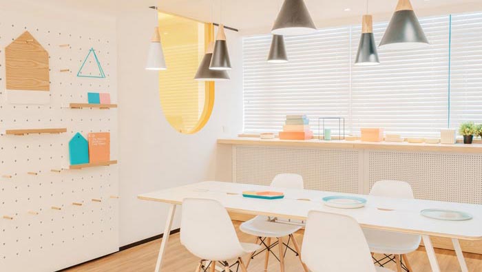 前臺區域的設計:設計師在設計的時候,采用白色做為主色調,其中加入了藍色、褐色等各種色彩,白色為主色調給人一種溫暖、明亮的感覺,其他顏色做為點綴之用,白色本身就有向外散發的屬性,可以在一定程度上提升空間的視覺感受。